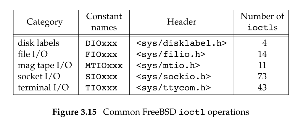 每个驱动设备可以定义它自己专用的 ioctl 命令,系统为不同种类的设备提供通用的 ioctl 命令,下面是 FreeBSD 支持的通用 ioctl 命令的一些类别: