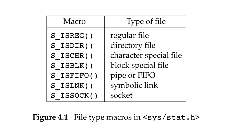 文件类型包含在 stat 结构中的 st_mode 成员中,可以用以下宏来检测,这些宏函数的参数都是 st_mode: