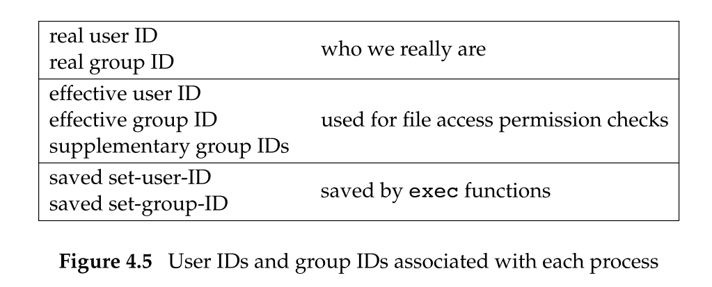 - 有效用户 ID 和有效组 ID 以及附属组 ID 决定了进程的文件访问权限。