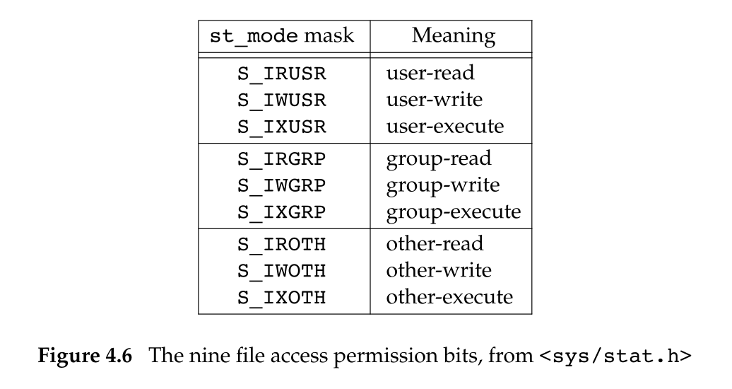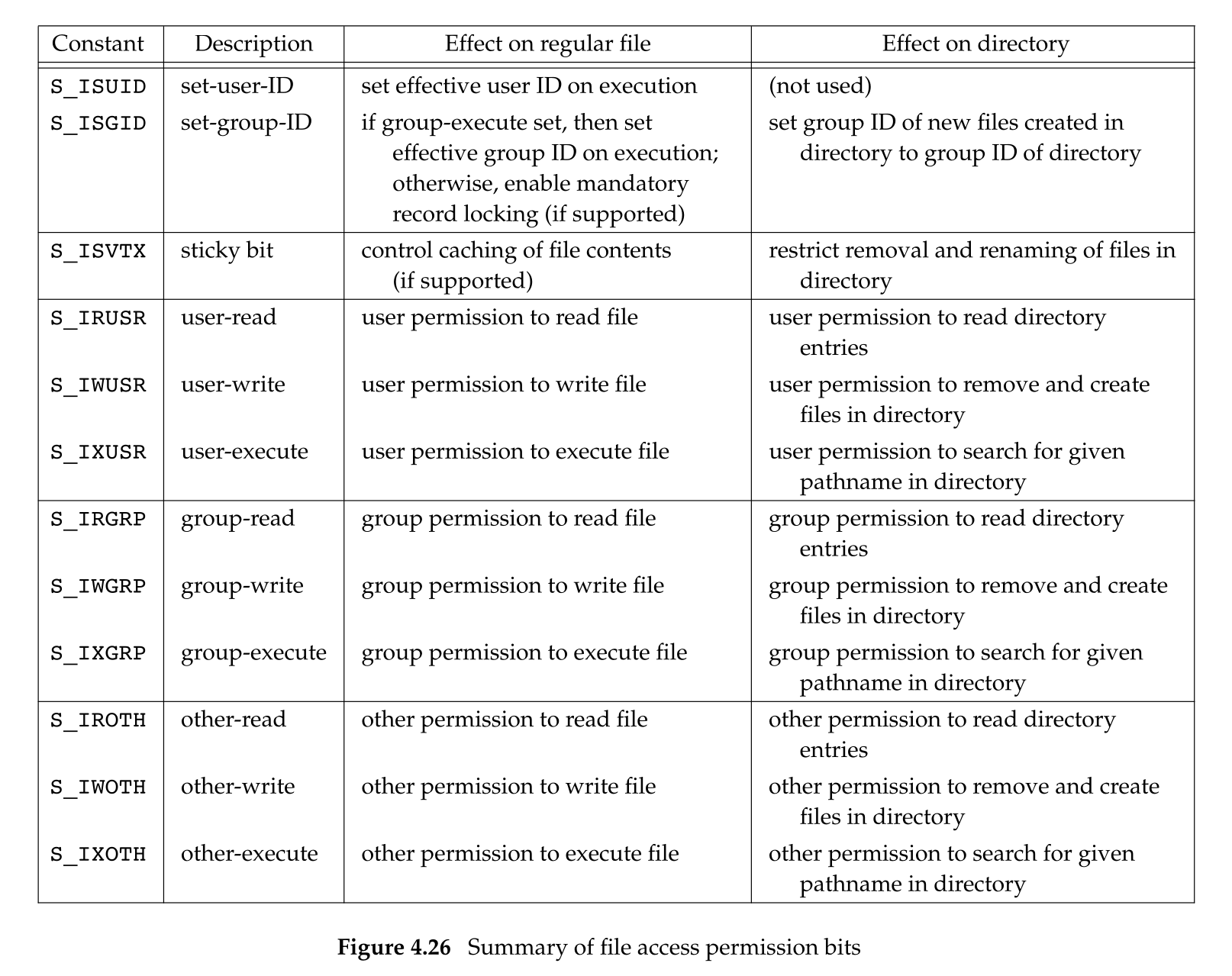 下图列出文件权限位常量以及分别对文件和目录的作用: