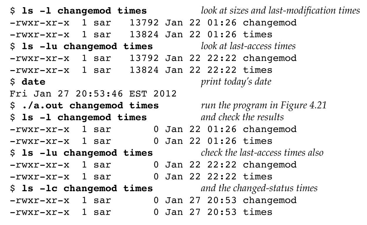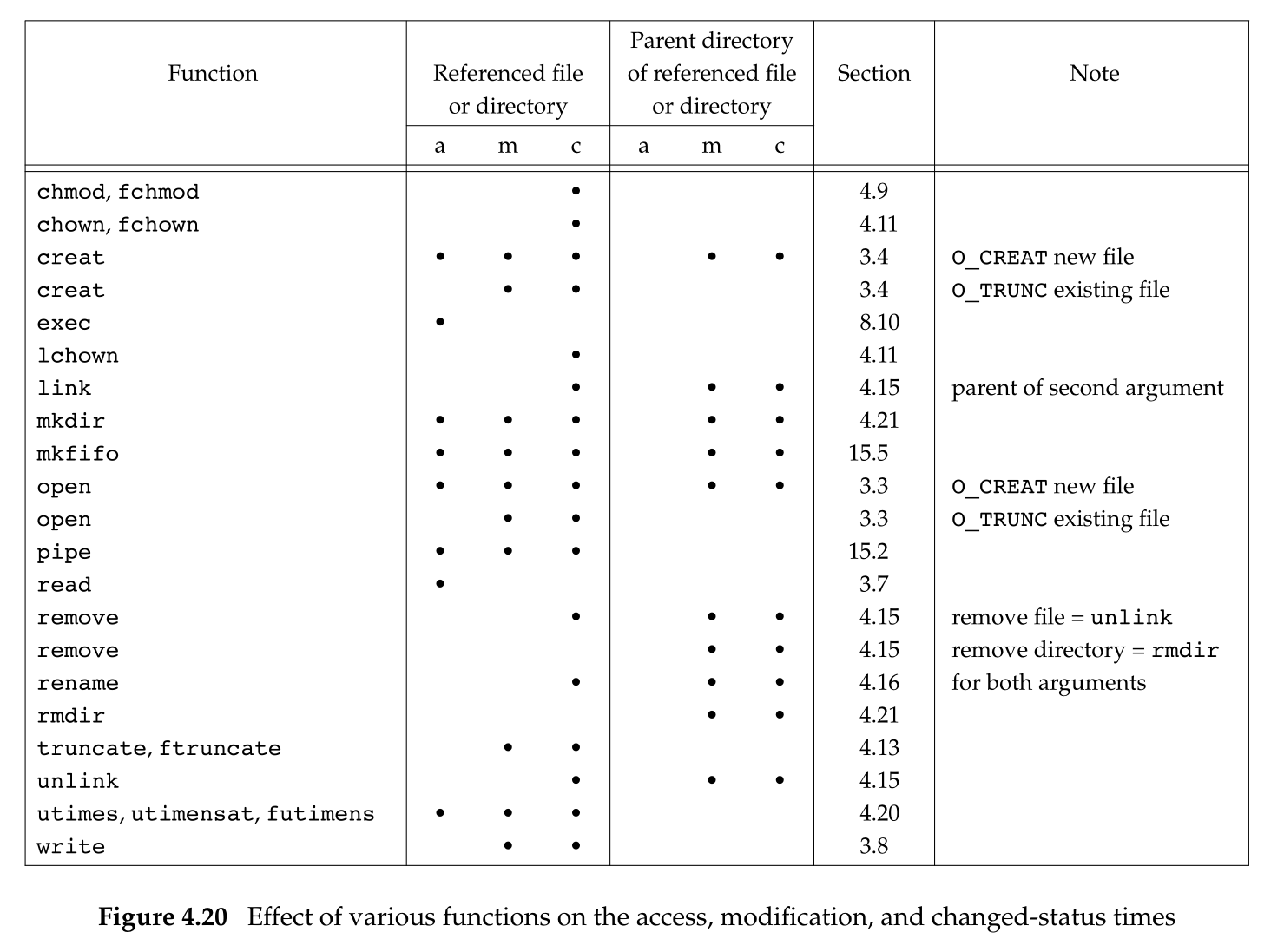 注意,不能更改状态时间 st_ctim (i-node 最近修改时间),这是因为在修改其他两个时间的时候,此字段会被自动更新。