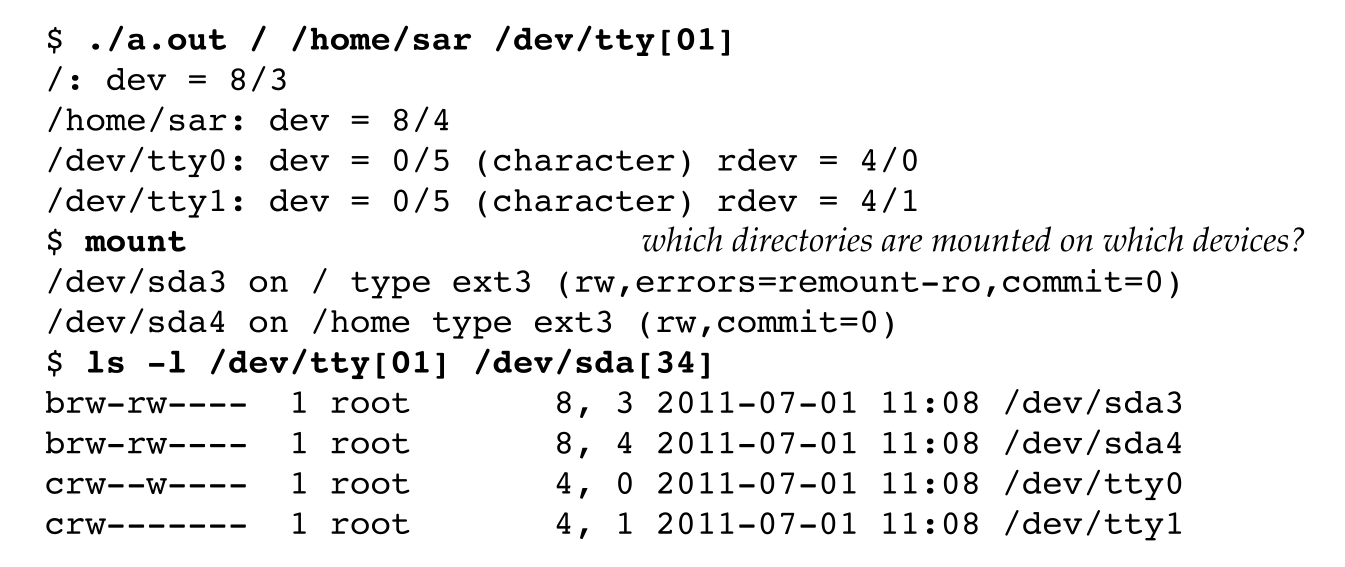 下面的程序会打印命令行参数的设备号,并且还会区分字符或块特殊文件:
