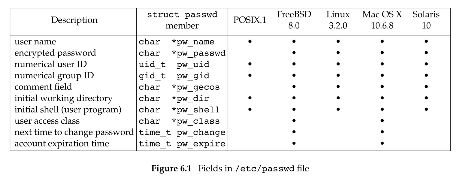 ls(1) 程序使用了 getpwuid 函数,它将 i-node 中的数字 ID 映射为用户的登录名。在键入登录名时,login(1) 程序会使用 getpwnam 函数。