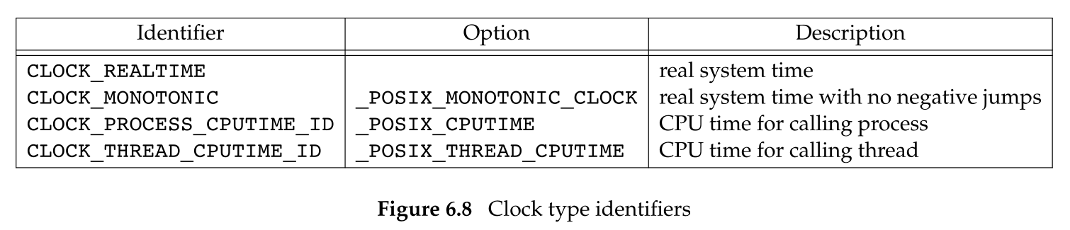 POSIX 的实时扩展增加了对多个系统时钟的支持。在 SUS v4 中,控制这些时钟的接口从可选组被移至基本组。时钟通过 clockid_t 类型进行标识,下面是标准值: