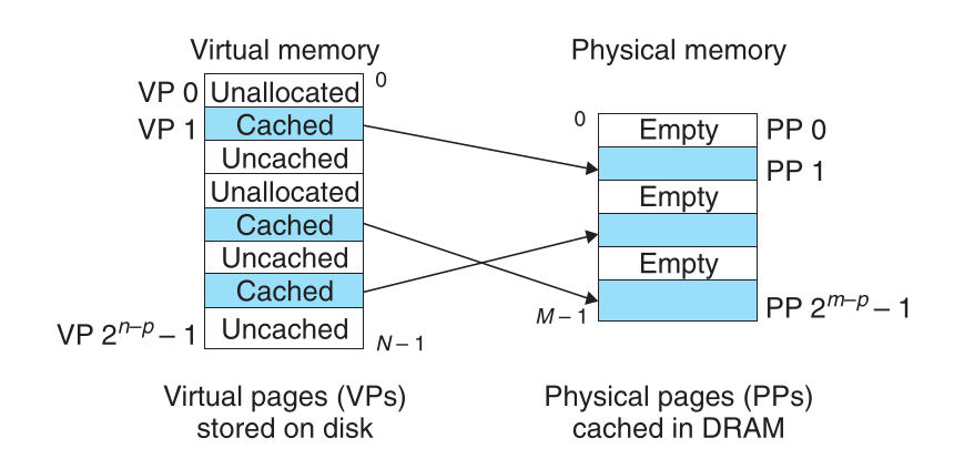 虚拟内存被组织为一个存放在磁盘上的 N 个连续字节的数组。每个字节都有一个虚拟地址,作为到数组的索引。磁盘上的内容被缓存到主存中:VM 系统将虚拟内存划分割为虚拟页大小的固定块,虚拟页是磁盘到较高层次储存器之间的数据传输单位。每个虚拟页的大小为 P = 2p 字节,类似的,物理内存也被划分为物理页 (页帧),大小也为 P。