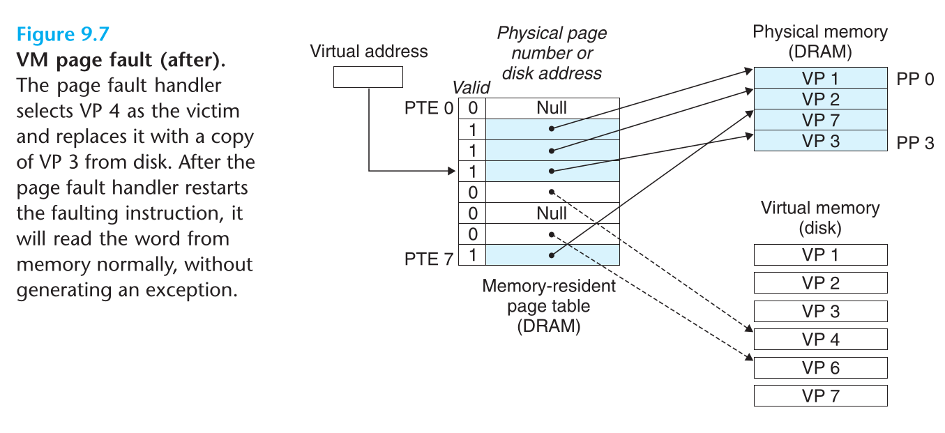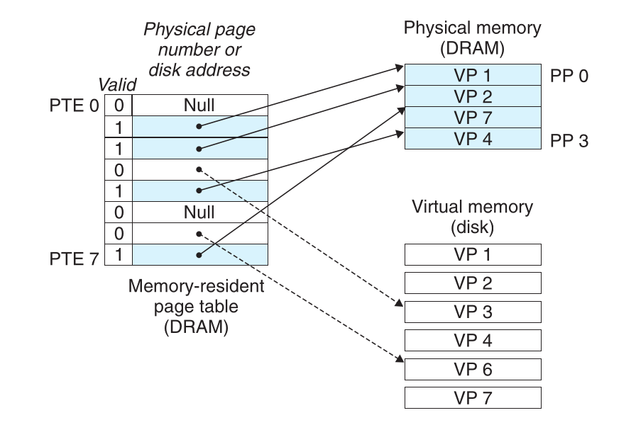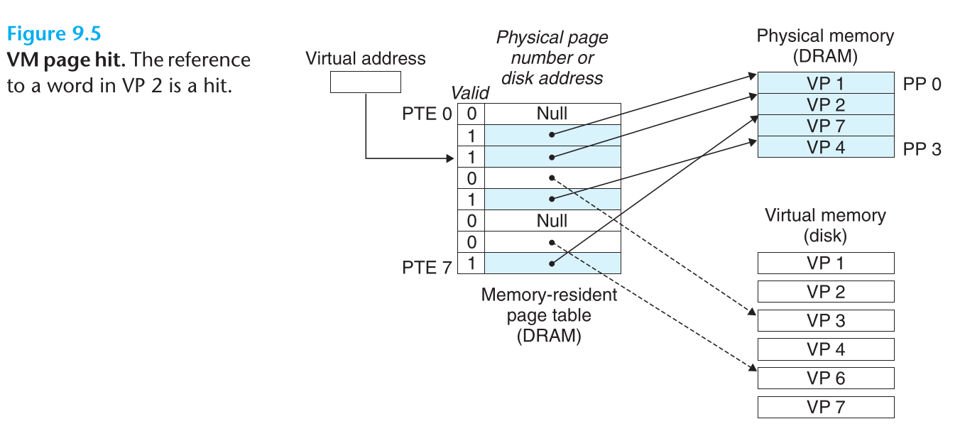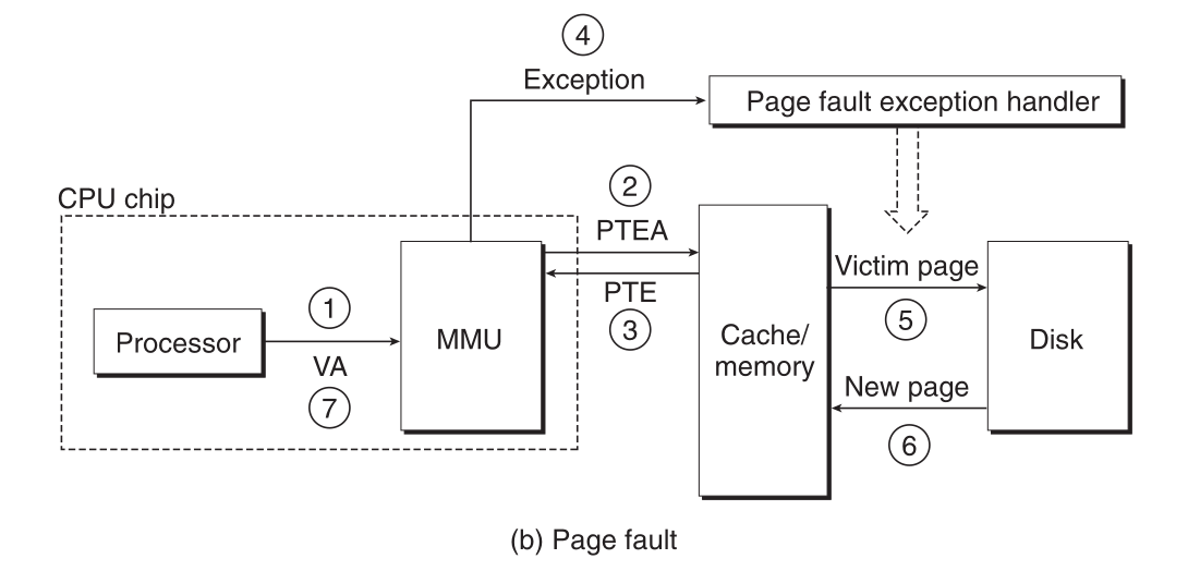 VM 系统通过页表来判定一个虚拟页是否缓存在 DRAM 中的某个地方,如果是,系统还必须确定这个虚拟页存放在哪个页帧中。如果不命中,系统还必须判断这个虚拟页存放在磁盘的哪个位置,然后再物理内存中选择一个牺牲页,将虚拟页从磁盘复制到 DRAM 中,并替换掉牺牲页。