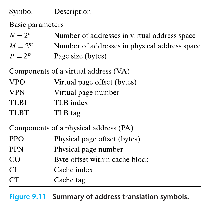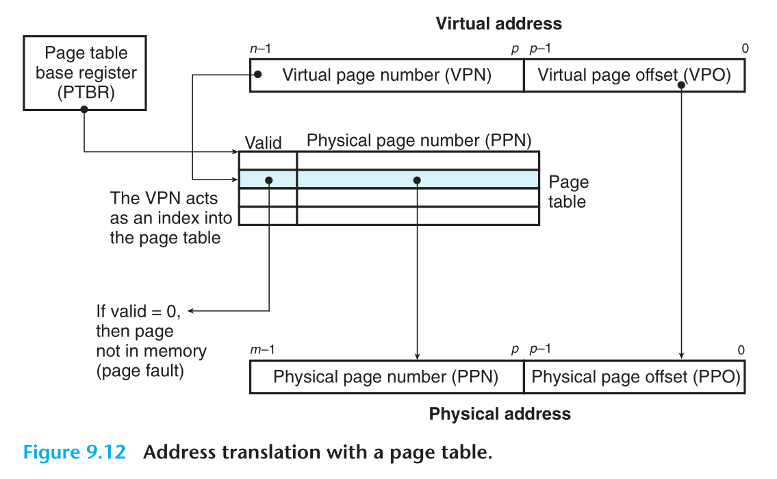 形式上来说,地址翻译是一个 N 元素的虚拟地址空间中的元素和一个 M 元素的物理地址空间中元素的映射。MMU 利用页表来实现这种映射,CPU 中的一个控制寄存器页表基址寄存器指向当前页表。n 位的虚拟地址包含两个部分:一个 p 位的虚拟页面偏移 VPO 和一个 n - p 位的虚拟页号 VPN。