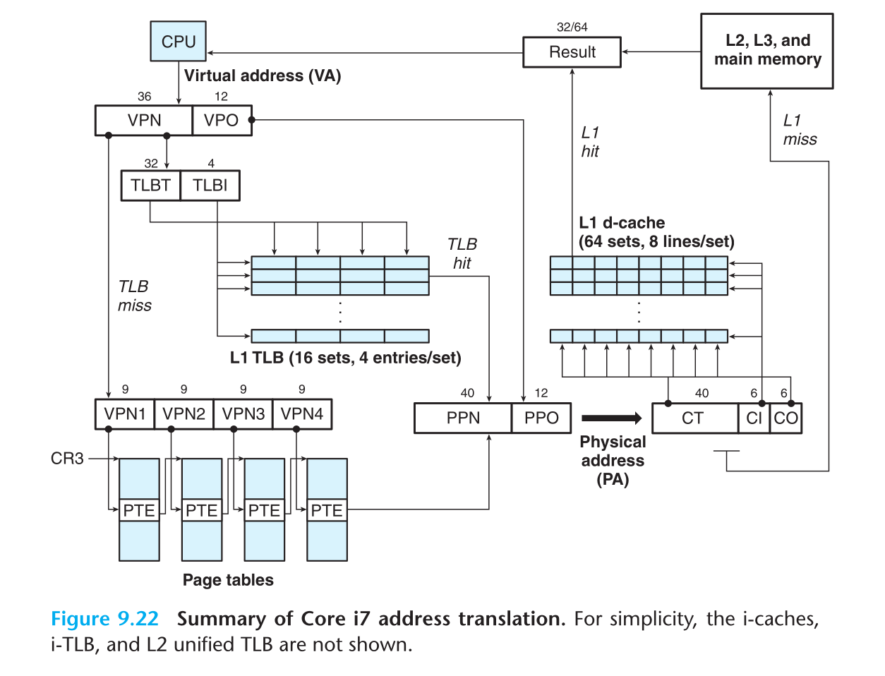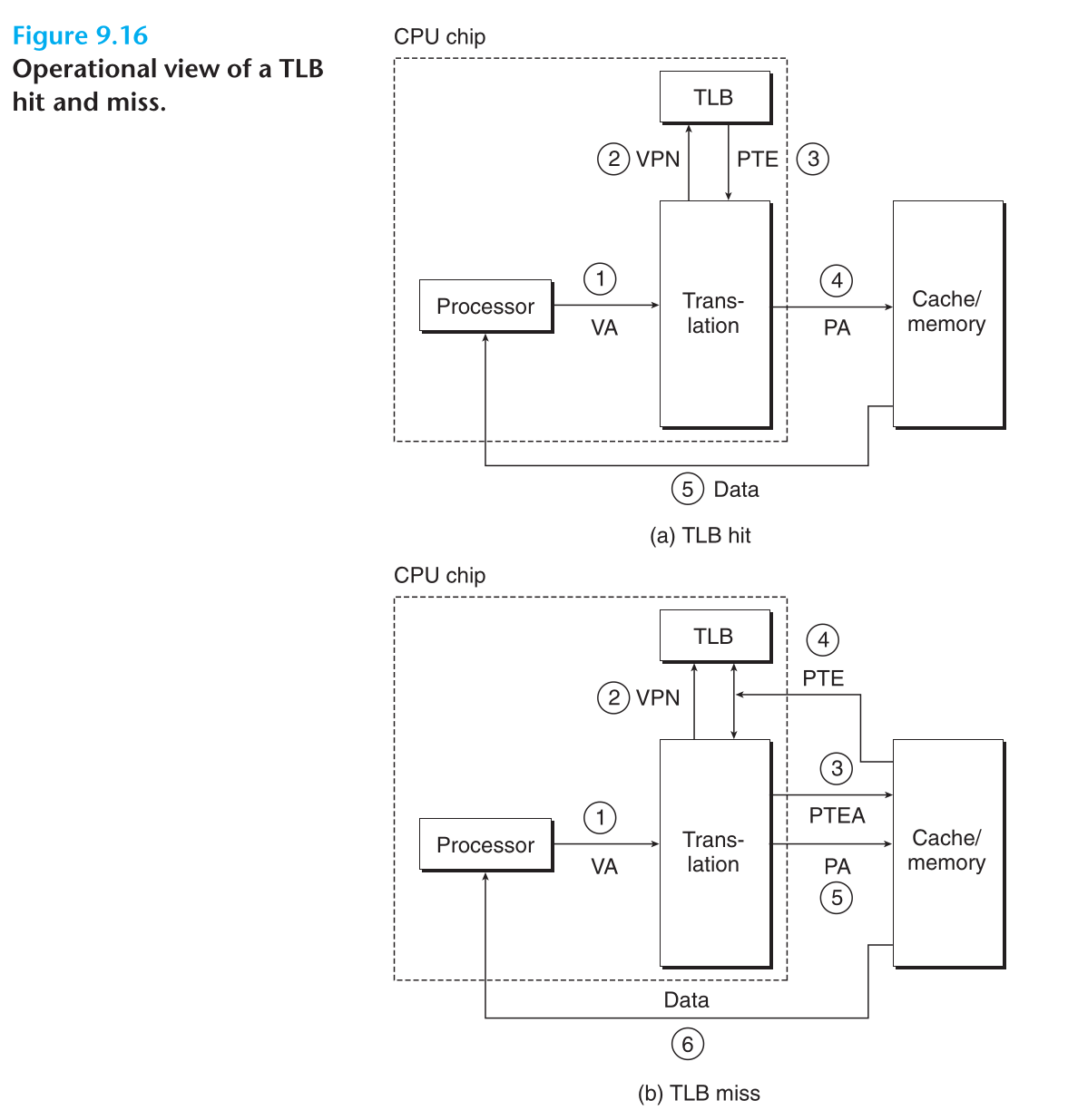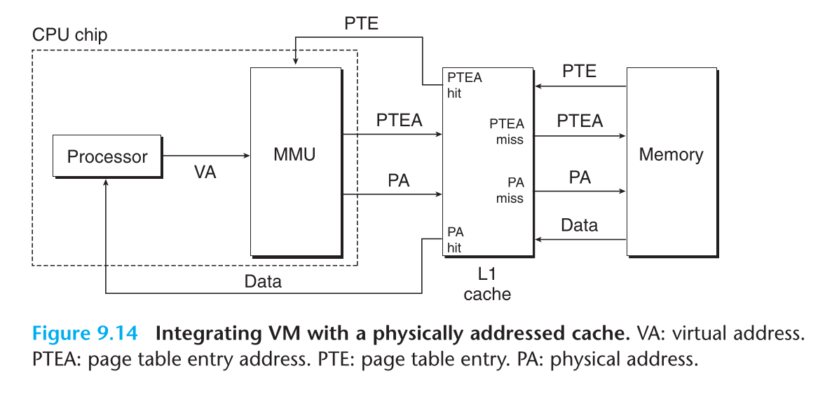 当 TLB 不命中时,MMU 必须从 L1 缓存中取出相应的 PTE。并且将新取出的 PTE 存放在 TLB 中,这可能会覆盖一个已存在的条目。