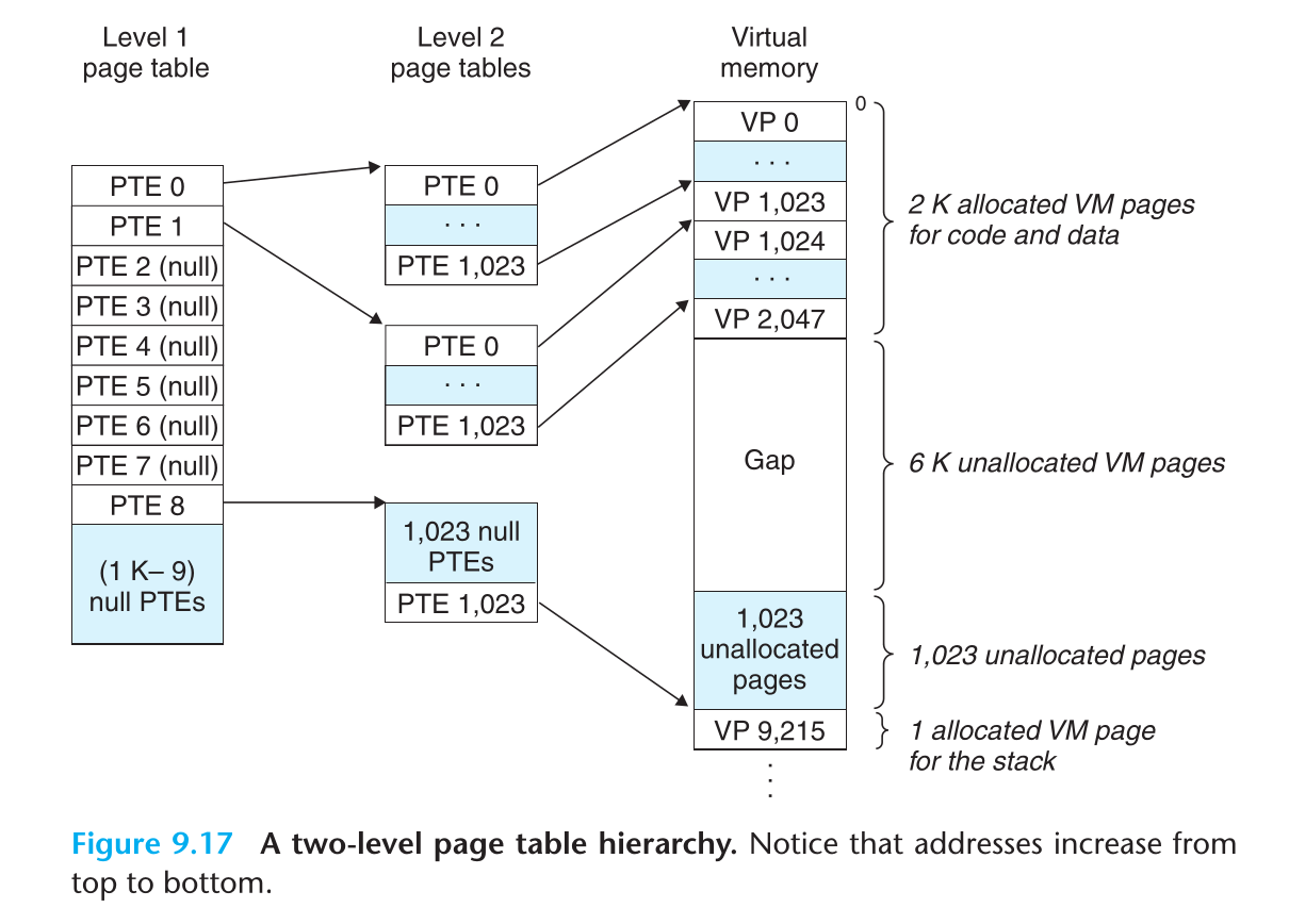 若一级页表中的 PTE 为空,那么二级页表内对应的条目就无需存在。多数应用程序的虚拟地址空间中大部分页面是未分配的,因此这将显著地降低页表的内存占用。另外,只需在主存中维护一级页表和被调用最为频繁的二级页表,其它的二级页表可以由操作系统按需创建和分页。