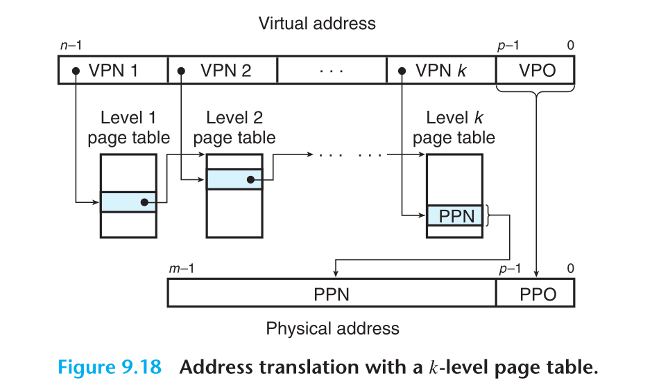 描述 k 级页表层次的地址翻译时,虚拟地址被划分为 k 个 VPN 和一个 VPO。每个 VPN i 都是一个到 i 级页表的索引。第 j 级页表的每个 PTE 都指向第 j + 1 级页表的基址。第 k 级页表中每个 PTE 都包含某个物理地址页面的 PPN 或者磁盘地址。