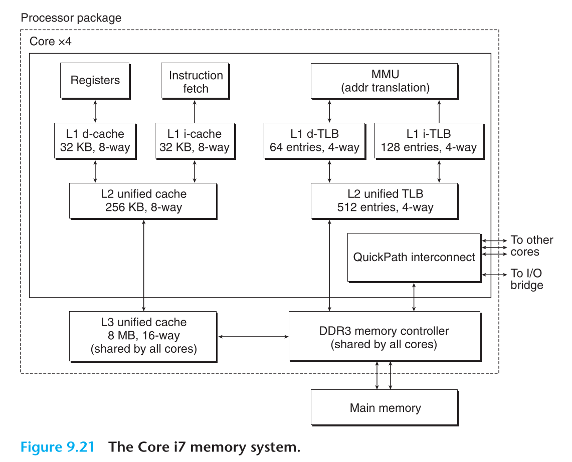 在这个系统中,CPU 有四个核心,且每个核心都有自己的 L1 L2 级高速缓存,所有的核心共享一个 L3 高速缓存。并且三级缓存都使用物理寻址。页大小可以在启动时被配置为 4KB 或者 4MB,Linux 使用 4KB 的页。