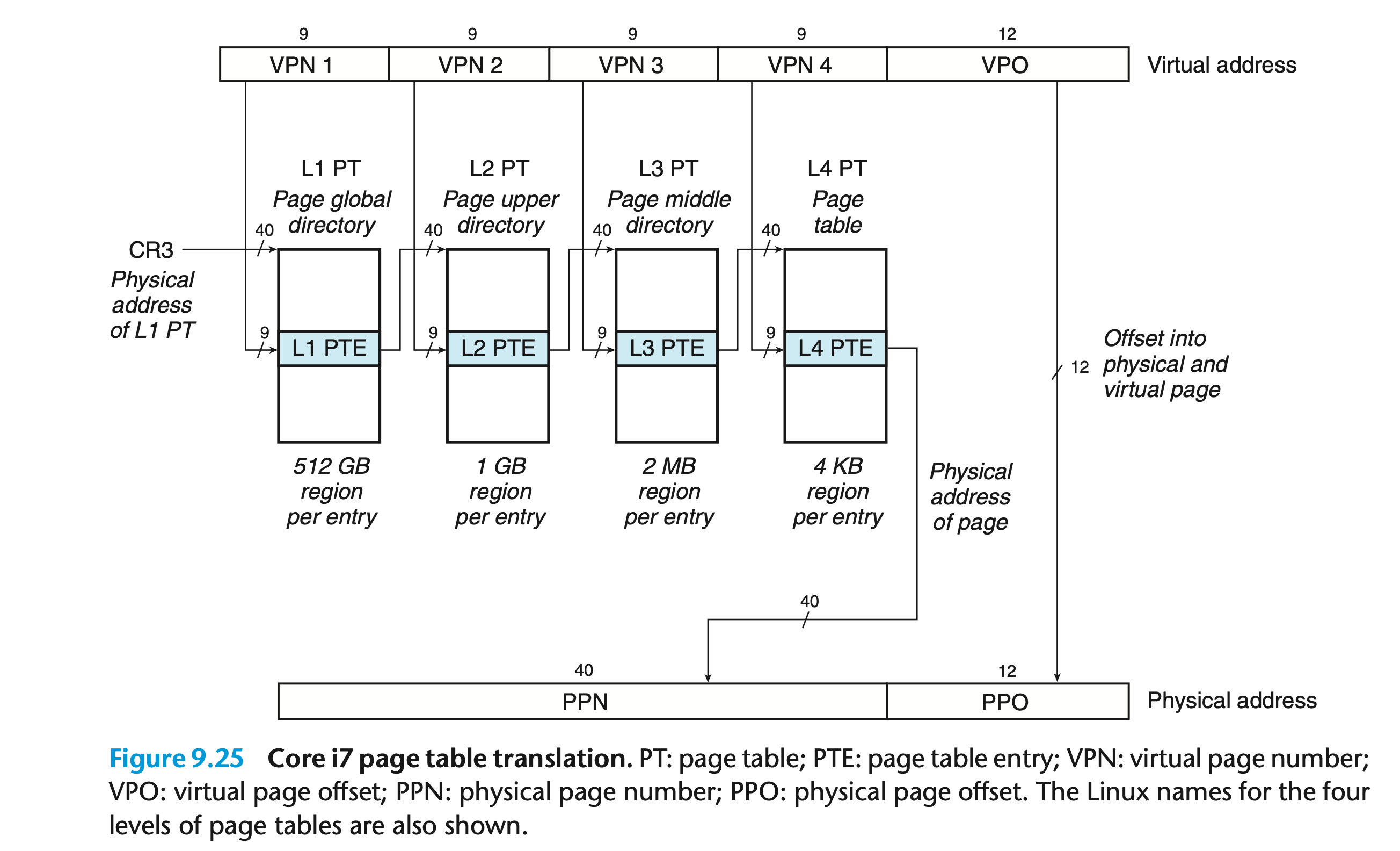 Core i7 使用四级页表层次结构,每个进程都有自己私有的页表层次结构。当一个 Linux 进程运行时,虽然 Core i7 体系允许页表换进换出,但是与已分配的页相关联的页表都是驻留在主存中的。CR3 寄存器指向一级页表 L1 的起始位置,CR3 的值是每个进程上下文的一部分,每次上下文切换时,CR3 的值都会被恢复。