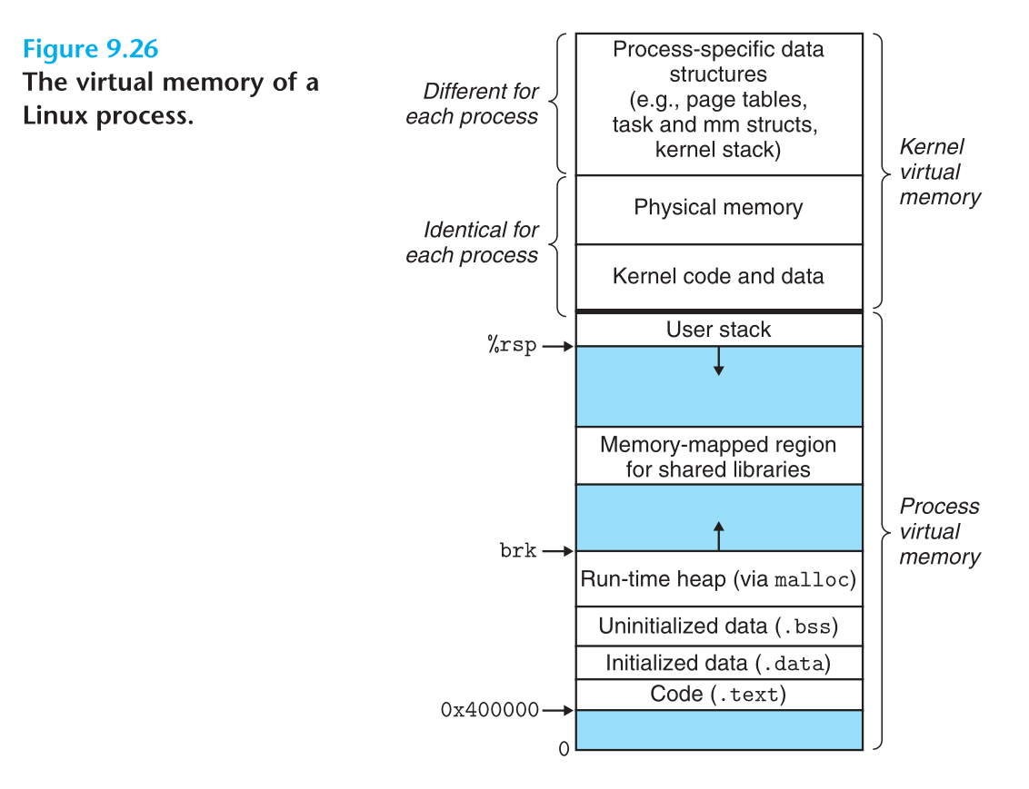 按需页面调度和独立的虚拟地址空间结合简化了系统中内存使用和管理。特别的,VM 系统简化了链接和加载,代码和数据的共享,以及应用程序的内存分配。