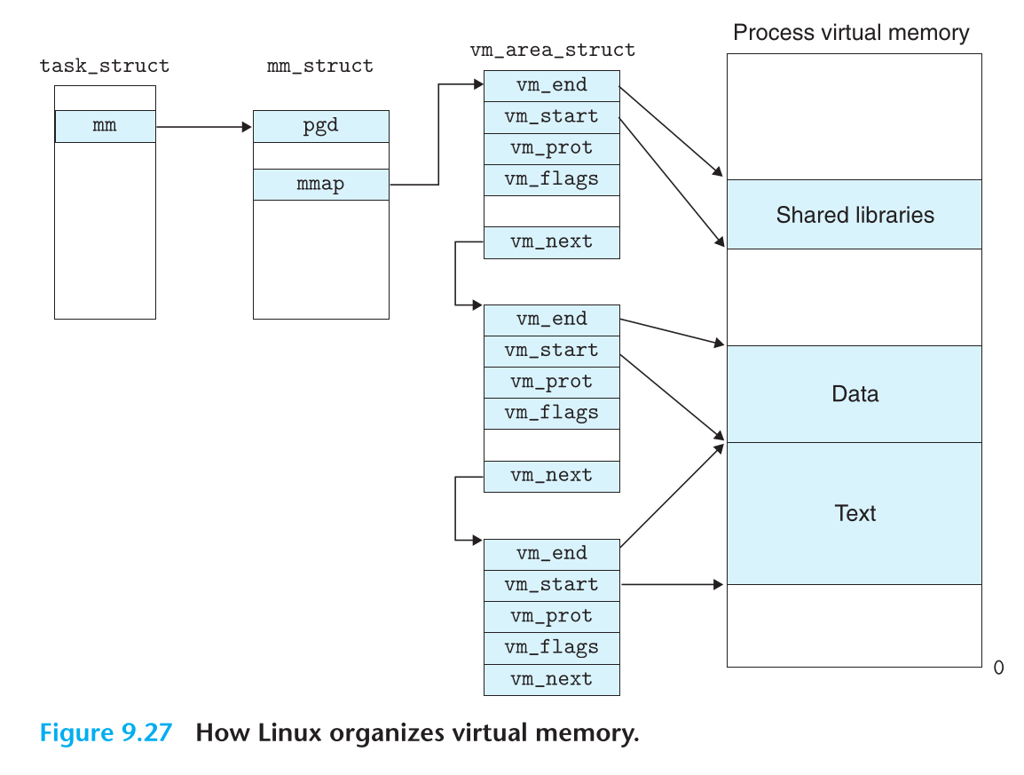 任务结构的一个条目指向 mm_struct,后者描述了虚拟内存的当前状态。结构中 pgd 指向一级页表的基址,mmap 指向一个 vm_area_structs 区域结构的链表。其中每个 vm_area_structs 都描述了当前虚拟地址空间的一个区域。当内核运行这个进程时,就将 pgd 放进 CR3 寄存器中。
