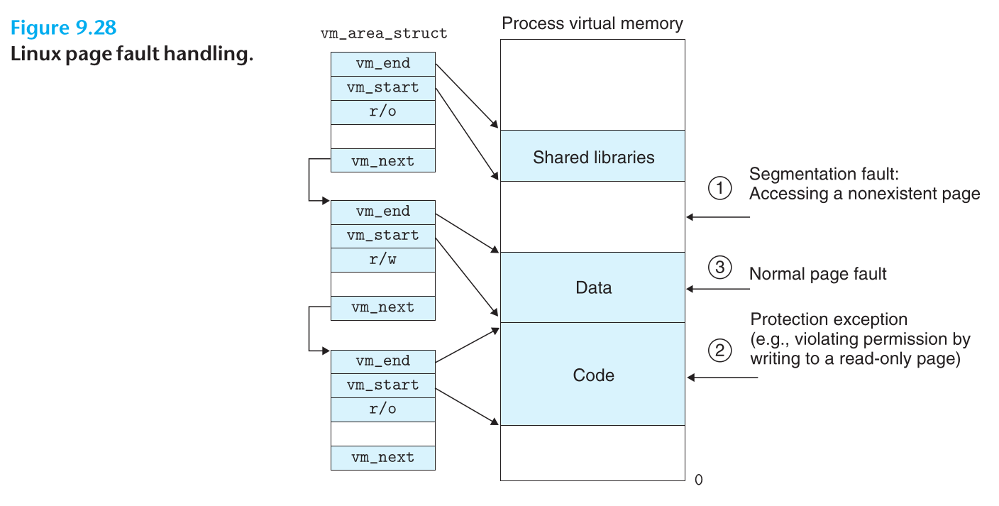 如果某条指令违反了上述权限,CPU 就会触发通用保护故障,并将控制权转移到内核中的异常处理程序。该处理程序会向问题进程发送一个 SIGSEGV 信号,shell 通常将此异常报告为段故障并终止程序。