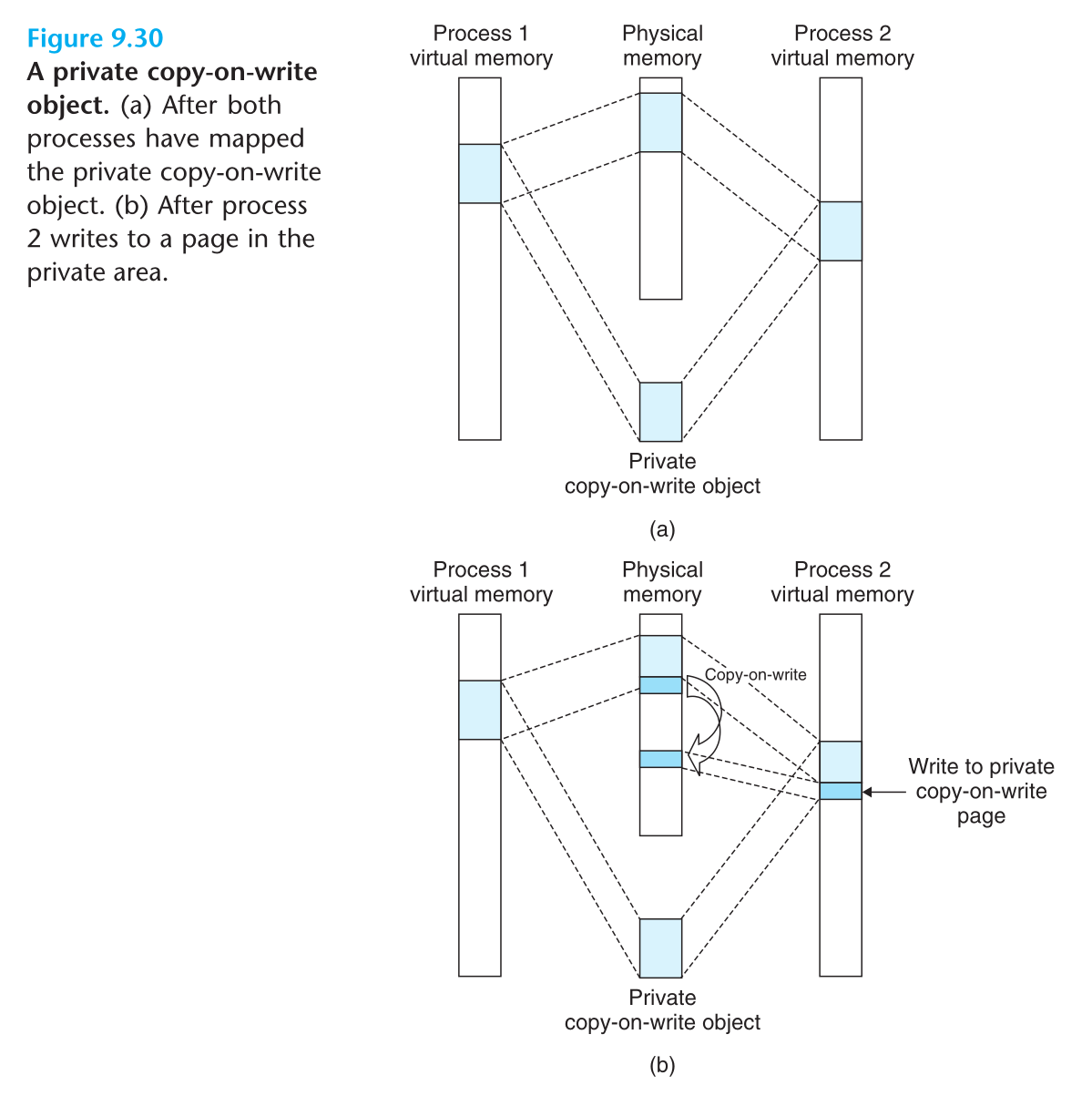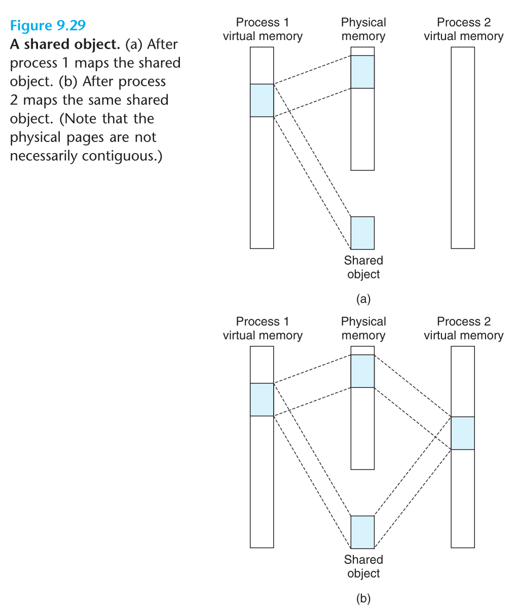 进程 i 的页表将 VP1 映射到 PP2,将 VP2 映射到 PP7。进程 j 的页表将 VP1 映射到 PP7,将 VP2 映射到 PP10。注意:多个虚拟页面可以映射到同一个共享物理页面。