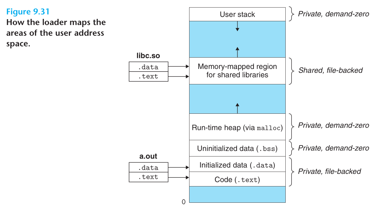 - 映射私有区域:为新程序的代码,数据,bss 和栈区创建新的区域结构,所有这些新区域都是私有的,写时复制的。代码和数据被映射为文件中的 .text 和 .data 区。bss 区域是请求二进制零的,映射到匿名文件,其大小在程序文件中定义。栈区和堆区也是请求二进制零的,初始长度为零。