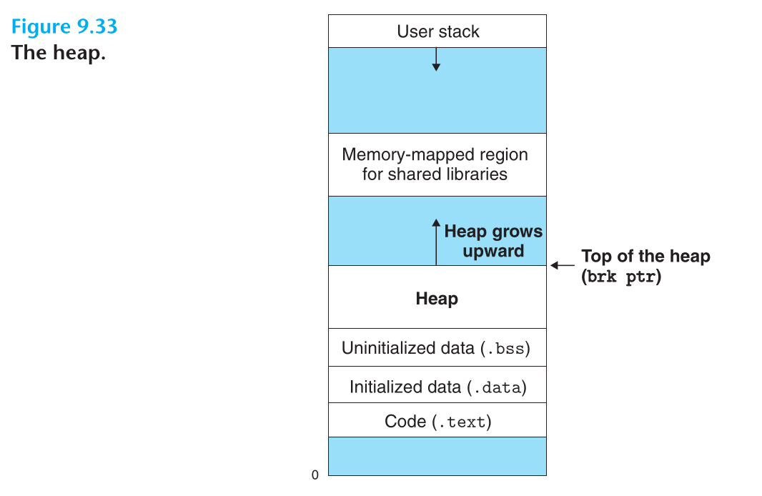动态内存分配器维护着一个进程的虚拟内存区域,称为堆。假设堆是一个请求二进制零的区域,它紧接在 bss 段后面开始,并并且向上生长。对于每个进程,操作系统都维护一个变量 brk,它指向堆顶。