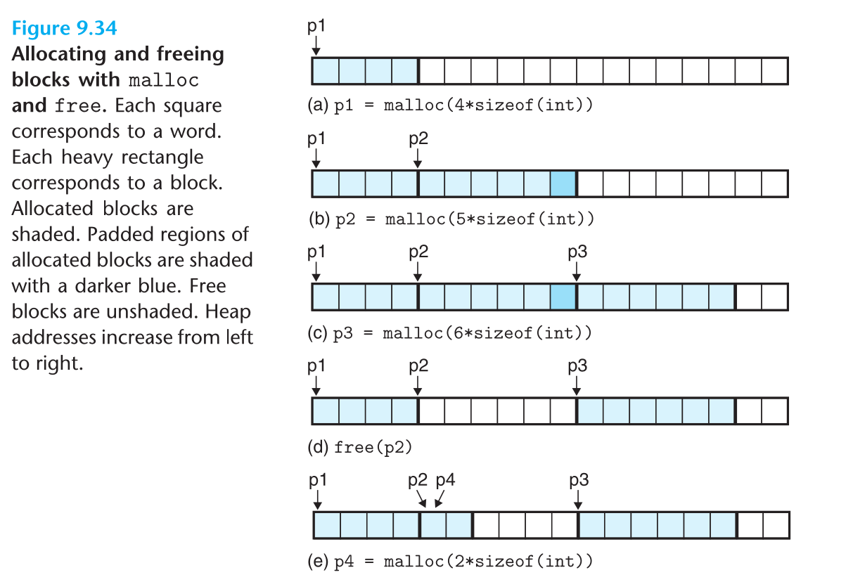 分配器将堆视为一组不同大小的块的集合,每个块就是一个连续的虚拟内存片,要么是已分配的,要么是空闲的,空闲块可以用来分配。一个已分配的块保持已分配状态,直到它被释放,释放要么是有程序显示执行,要么是内存分配器隐式执行。