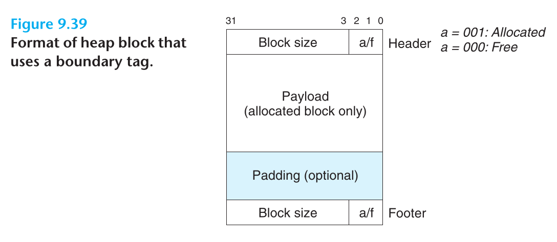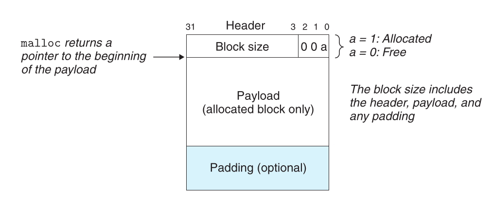在这种情况中,一个块是由一个字 (这里是 4 字节),有效载荷,以及可能的额外填充块组成的。头部编码了这个块的大小 (包括头部和填充),以及这个块是已分配还是空闲的。因为对齐要求,这个块的大小总是 8 的倍数,所以低三位总是 0,那么可以将低三位拿来指明块是已分配的还是空闲的。