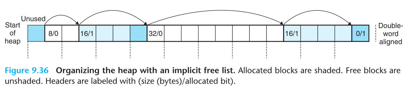 这种结构称为隐式空闲链表,是因为空闲块是通过头部中大小字段隐含的连接的。分配器可以通过遍历堆中所有块,从而间接的遍历所有的空闲块。最后需要一个终止标记 (0 / 1) 即大小为 0 的已分配块。
