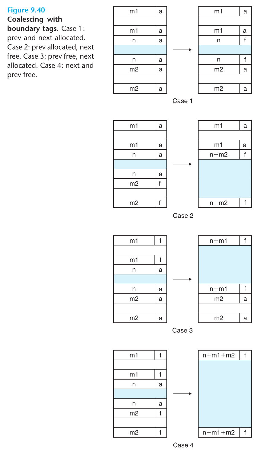 当分配器释放一个已分配块时,可能有其他空闲块与这个新释放的块相邻。这些相邻的空闲块引起一种假碎片现象,即有许多可用的空闲块被分割为小的,无法使用的空闲块。如果释放上面的已分配块,虽然中间已经空出来 8 字,但是却因为假碎片无法相应一个 4 字请求。